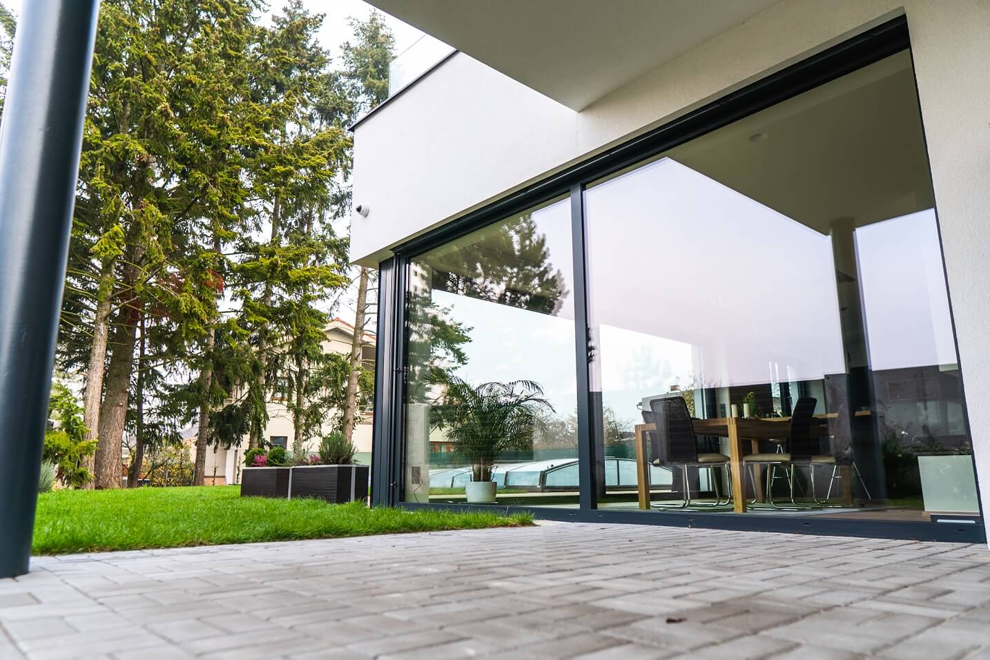 - Úspora prostoru: Otevírání křídla posuvem do strany znamená, že při otevření nezasahuje do interiéru ani exteriéru. To šetří místo a umožňuje efektivnější uspořádání nábytku a dalších prvků v okolí dveří.