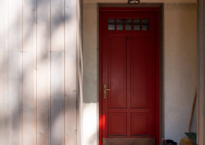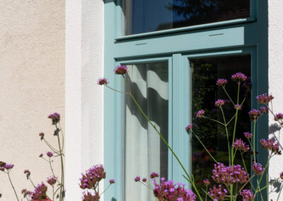 V rodinném domě ve Svučicích jsme realizovali dřevěná okna a vstupní dveře z profilu Single 78. Všechna okna byla osazena izolačním trojsklem a doplněna nalepovacími i sklodělícími příčkami, které dotvářejí jejich elegantní členění. Speciální odstín dle vzorníku NCS pak dodává celé stavbě osobitý charakter a ladí s moderní architekturou domu.