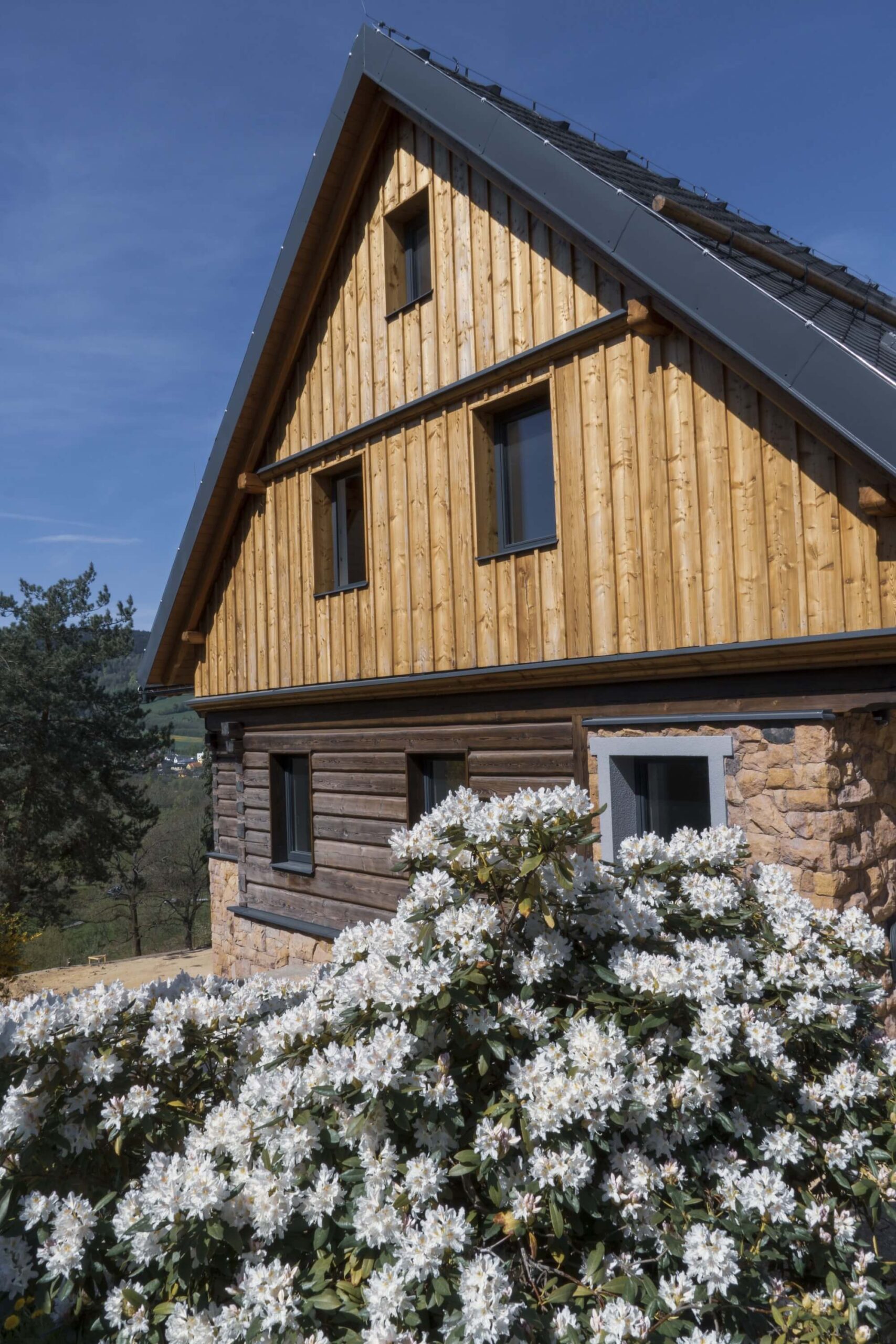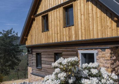 V rodinném domě v Libereckém kraji jsme realizovali montáž oken z dřevohliníkového profilu Aluwood Premium s vnějším hliníkovým opláštěním značky Gutmann. Kombinace přírodního dřeva z interiéru a odolného hliníku z exteriéru zajišťuje dlouhou životnost, minimální údržbu a současně elegantní vzhled.