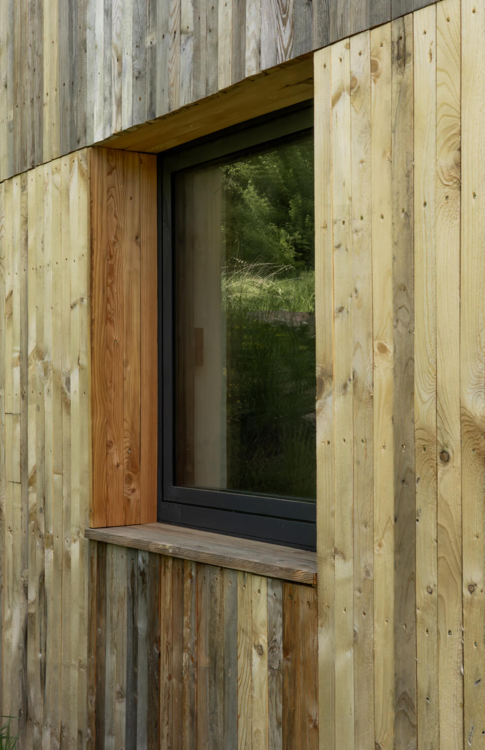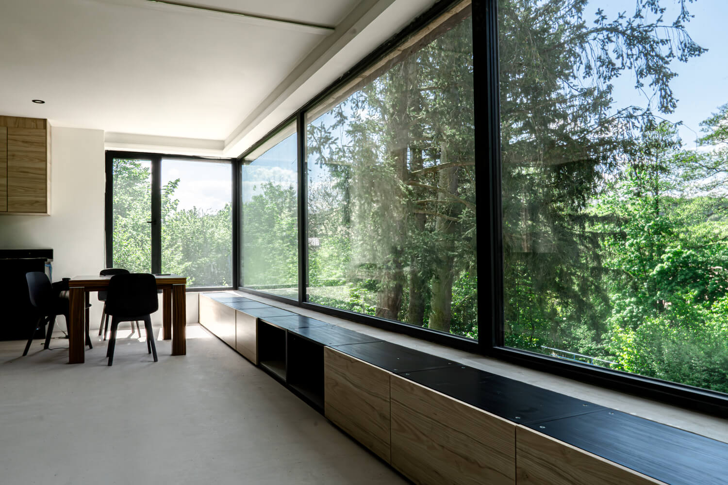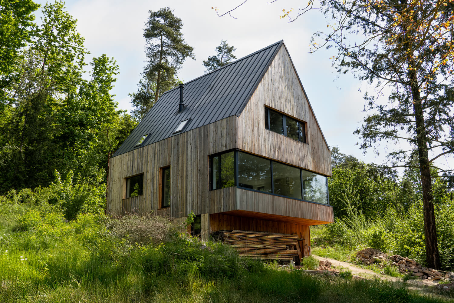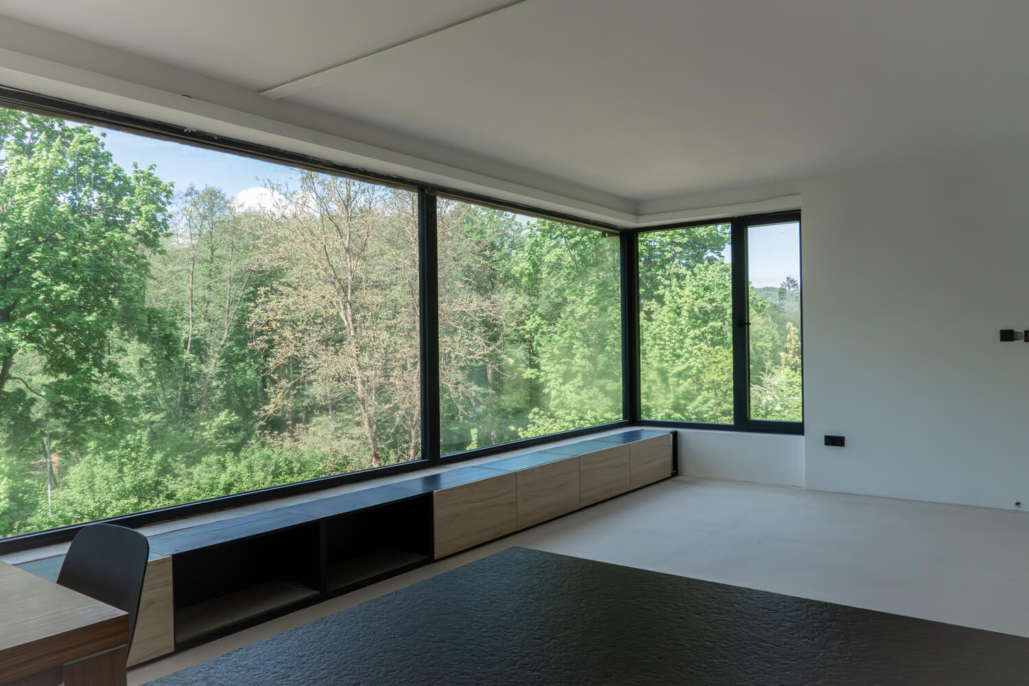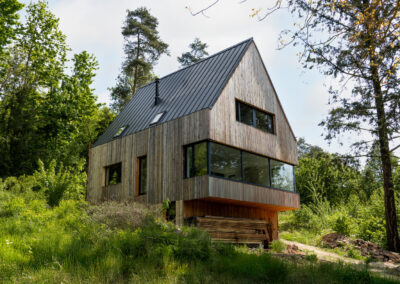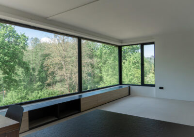 Dominantním prvkem celé realizace je třináctimetrová rozvinutá prosklená stěna v obývacím pokoji, která otevírá prostor směrem do otevřené krajiny. Toto řešení nejen zajišťuje maximální přístup denního světla, ale zároveň vytváří přímé propojení interiéru s okolní přírodou.