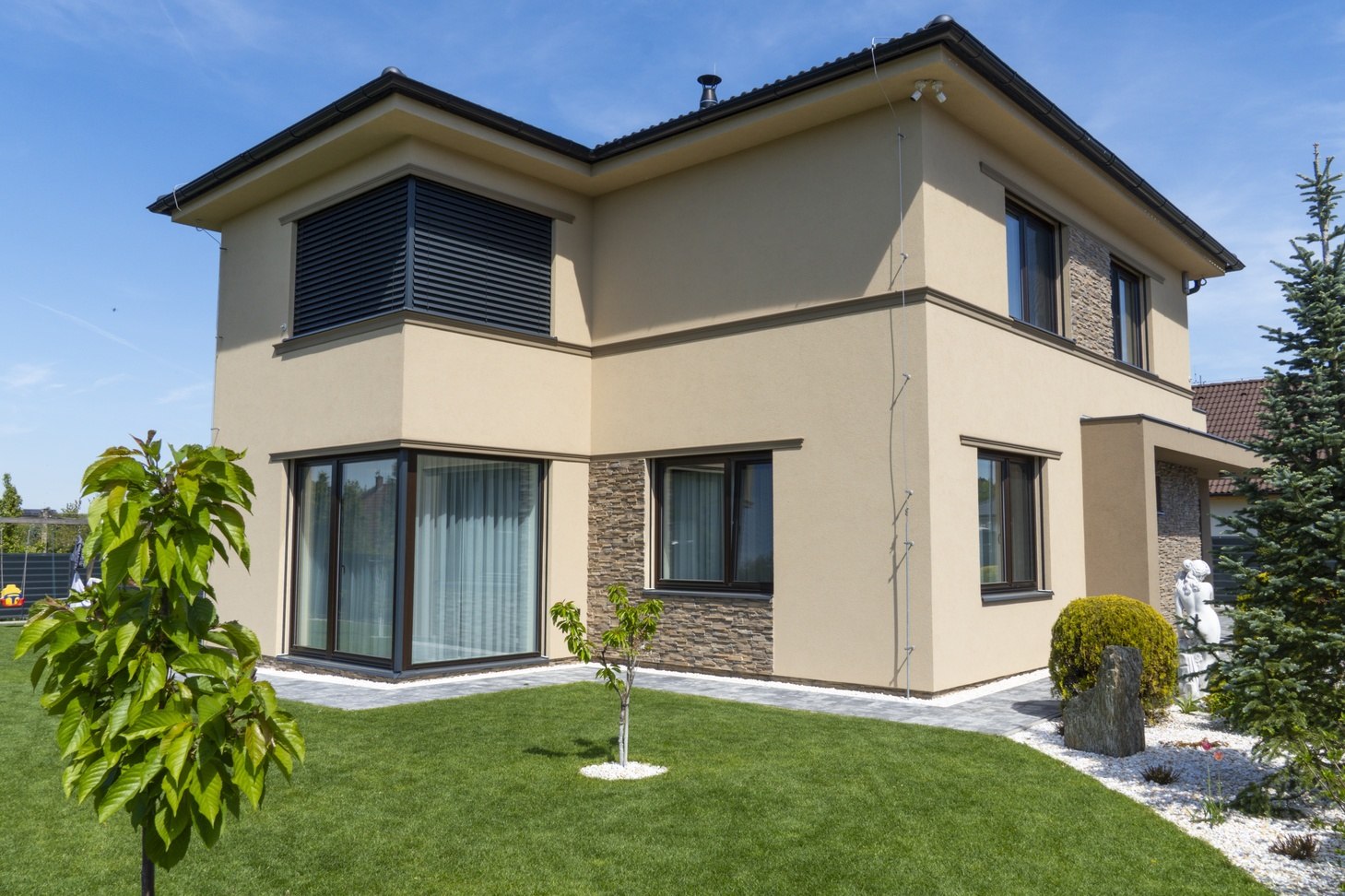 Součástí realizace byla také dodávka dřevěných oken a vstupních dveří Precise IV78 s izolačním trojsklem, které kombinují řemeslnou kvalitu s výbornými izolačními vlastnostmi. Projekt doplnila montáž sekčních garážových vrat a venkovních žaluzií Z-90 pro efektivní stínění a regulaci vnitřní teploty.