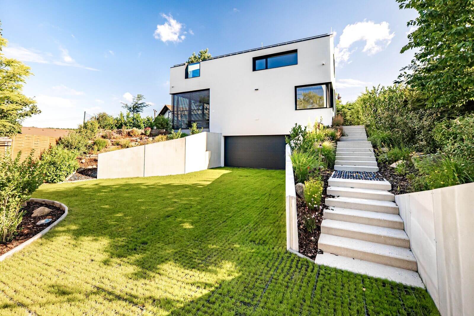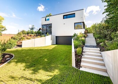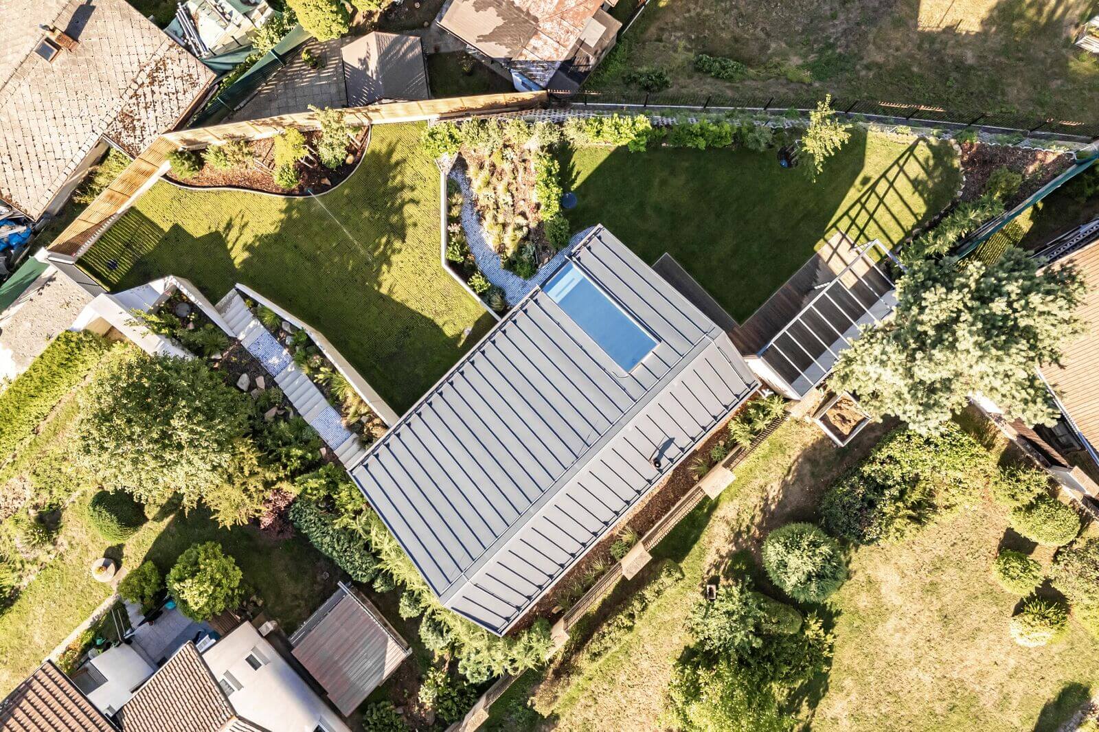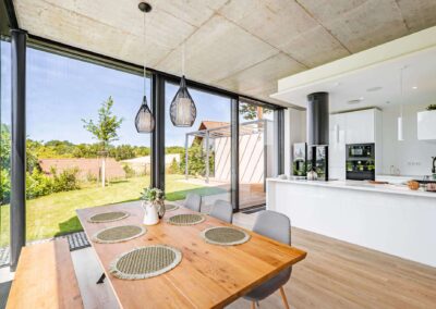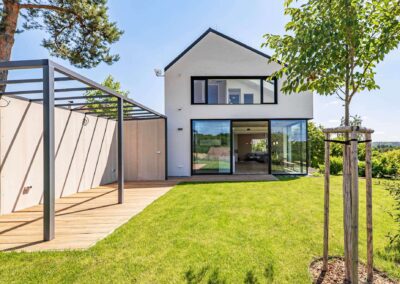 Komplexní hliníkový systém: Vedle posuvných prvků byly dodány také vchodové dveře a okna ve shodném designu, čímž bylo dosaženo materiálové jednoty celého domu.