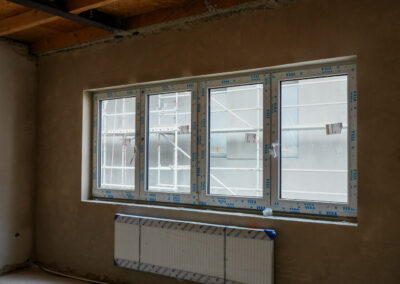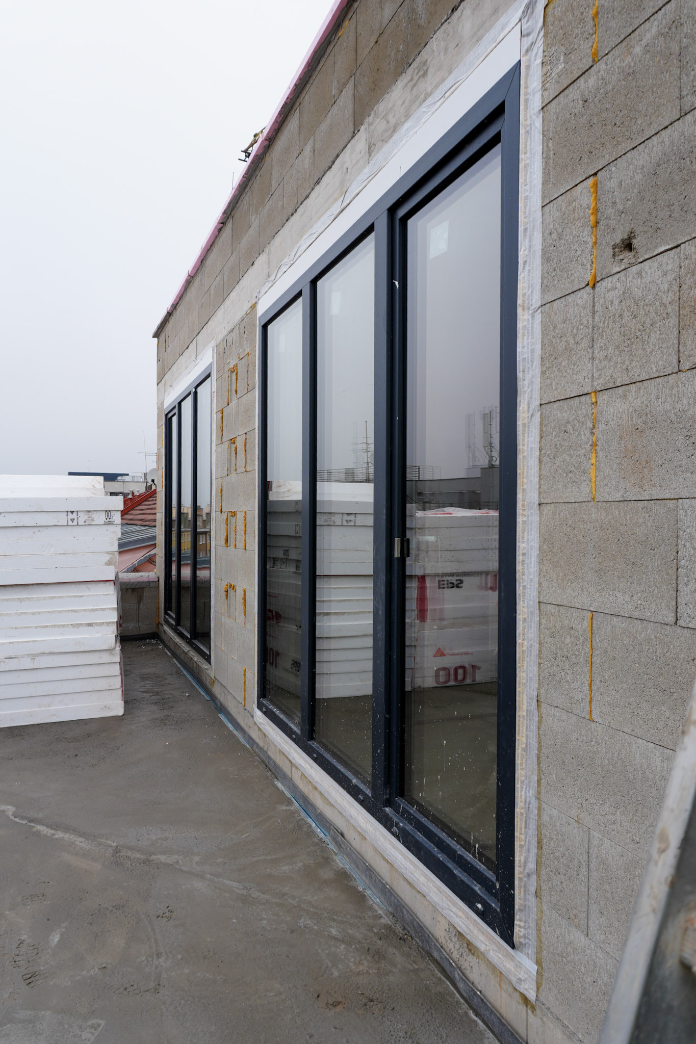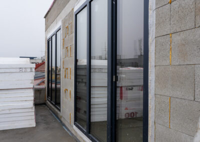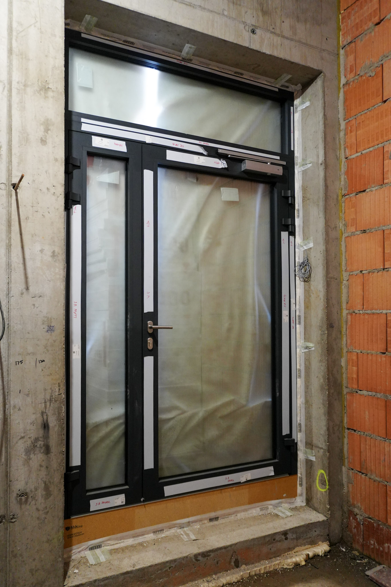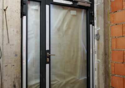 Součástí realizace byly také hliníkové dveře, konkrétně dvoje protipožární vchodové dveře, dvoje standardní vchodové dveře, jedny interiérové dveře a velká hliníková výloha. Celé řešení kombinuje moderní materiály s praktickým a komfortním využitím prostoru v bytovém domě.
