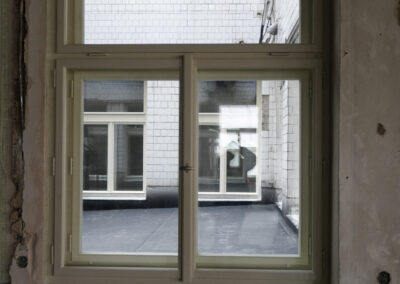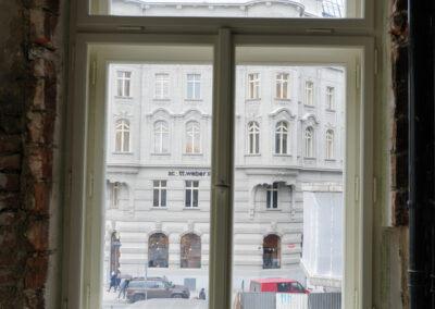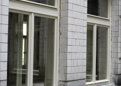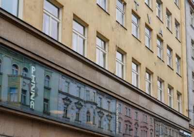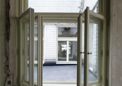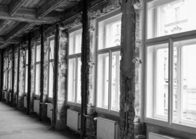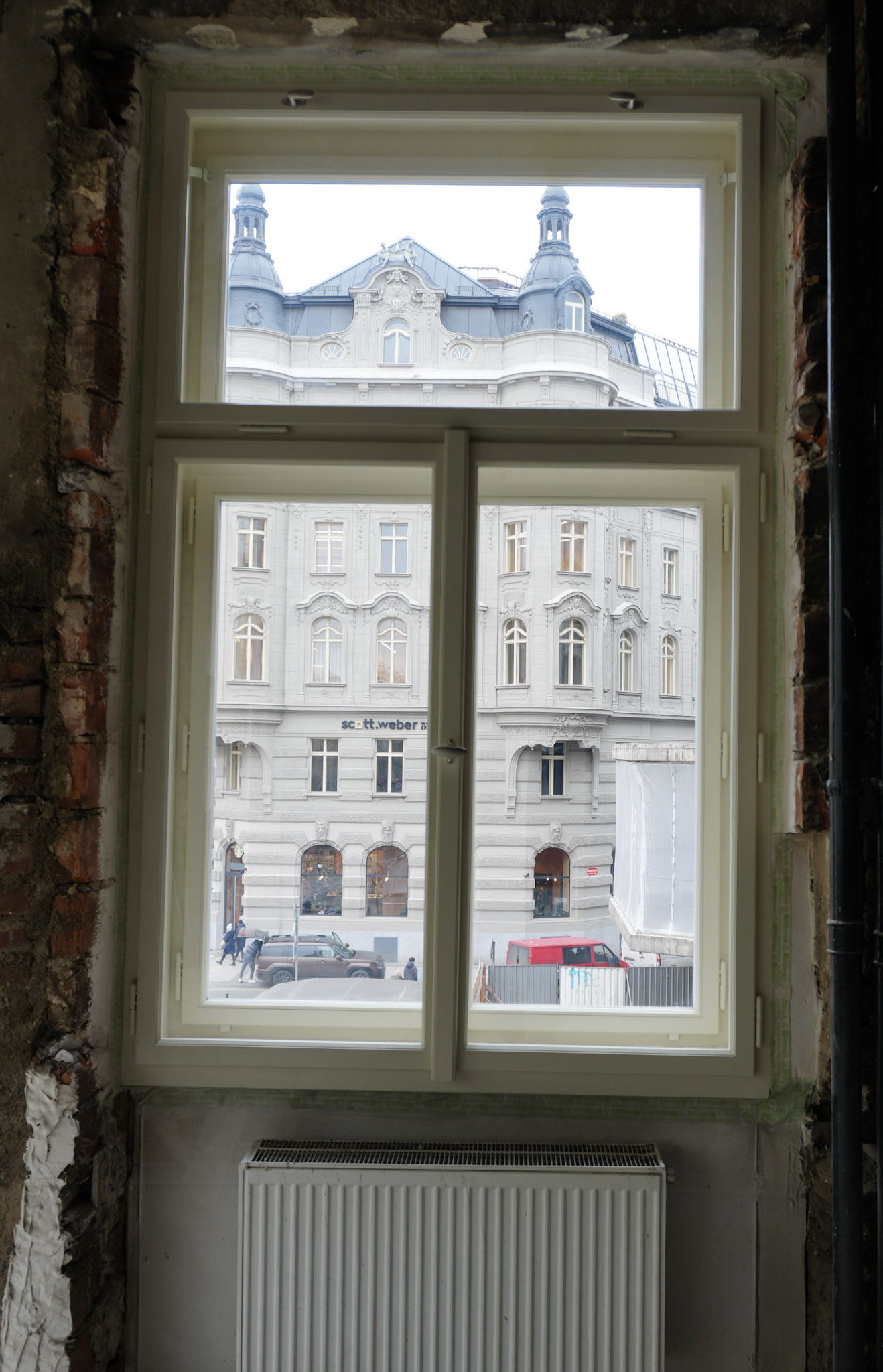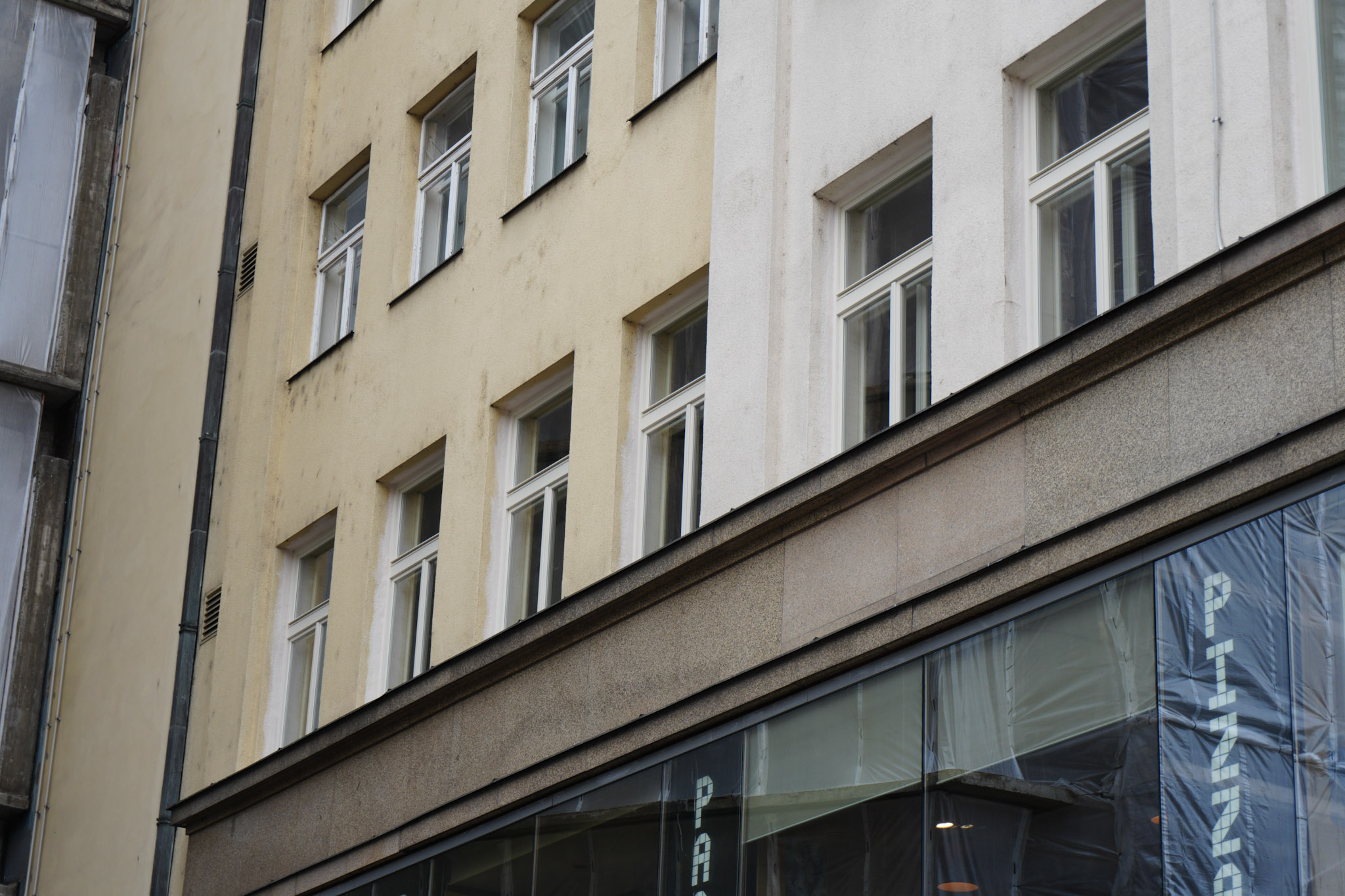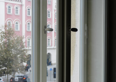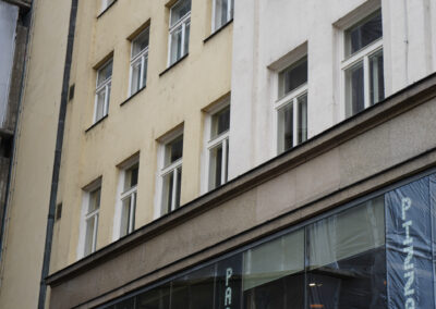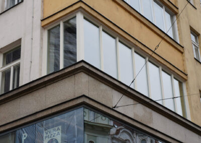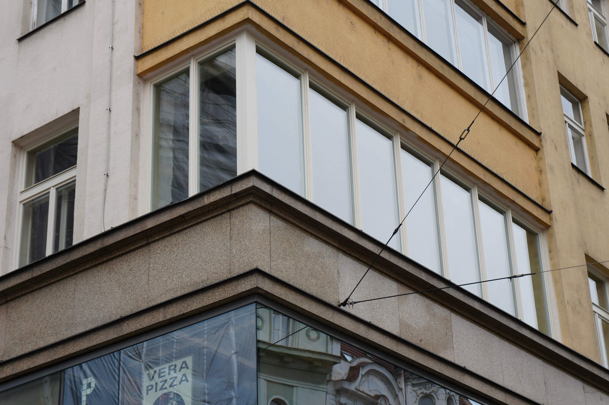 V rámci této realizace proběhla výměna původních oken za repliky historických špaletových oken v našem profilu Historic. Okna jsou osazena izolačním dvojsklem v exteriérové části a jednoduchým zasklením v interiéru s ohledem na charakter objektu a památkové požadavky. Součástí dodávky bylo také jednoduché rohové okno na hlavní fasádě v bezfalcovém provedení. Realizace probíhala v kancelářských prostorách celého jednoho patra budovy na adrese Revoluční 1, nad restaurací Pizza Nuova.
