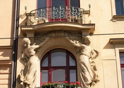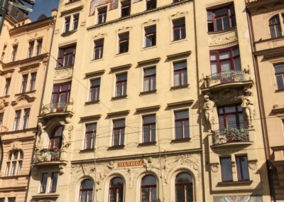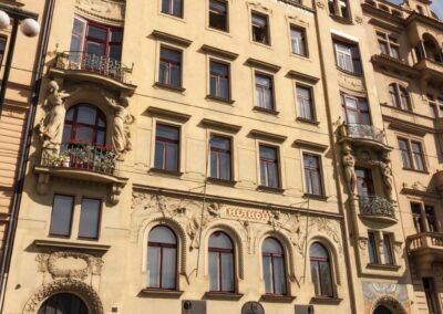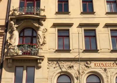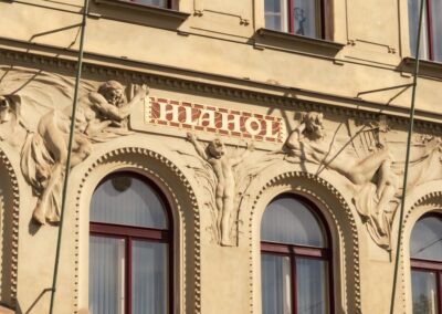 V secesním Spolkovém domě Hlahol na Masarykově nábřeží v Praze jsme realizovali přesné repliky historických kastlových oken a balkonových dveří ve dvoubarevném provedení. Součástí zakázky byly také dovnitř lomené okenní a balkonové sestavy na hlavní nábřežní fasádě, které vyžadovaly maximální preciznost a citlivý přístup k historickému charakteru stavby.